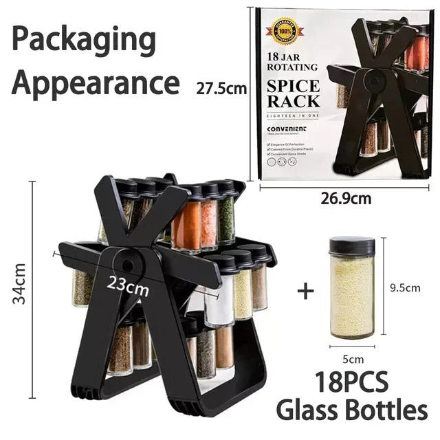 Keep your kitchen neat, organized, and stylish with this rotating spice rack set. Designed with convenience in mind, it comes with 18 clear glass jars to store all your favorite spices, herbs, and seasonings.