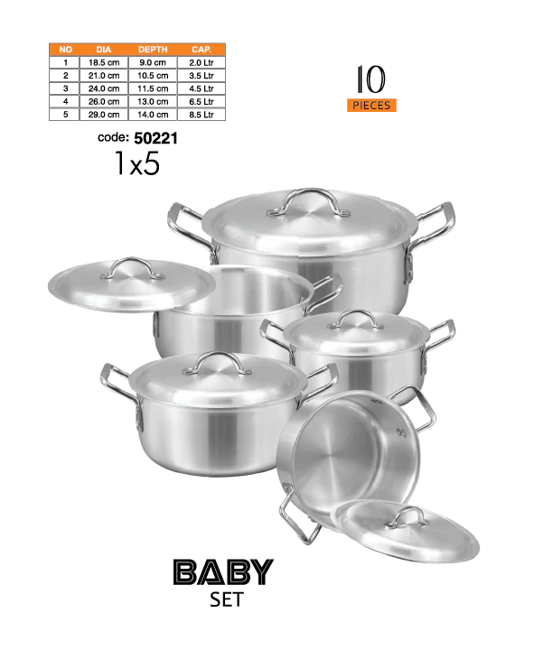 Sonex Stainless Steel Baby Set is a premium cookware collection designed for everyday home cooking with durability, performance, and classic style. Despite the name “Baby Set”, this refers to a 5-piece set of cooking pots in different sizes — ideal for a small family kitchen or as a basic starter cookware set in Pakistan